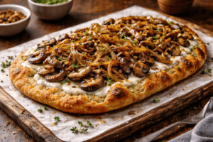 מתכון לפינסה קריספית עם קרם גבינות, פטריות צלויות ובצל מקורמל