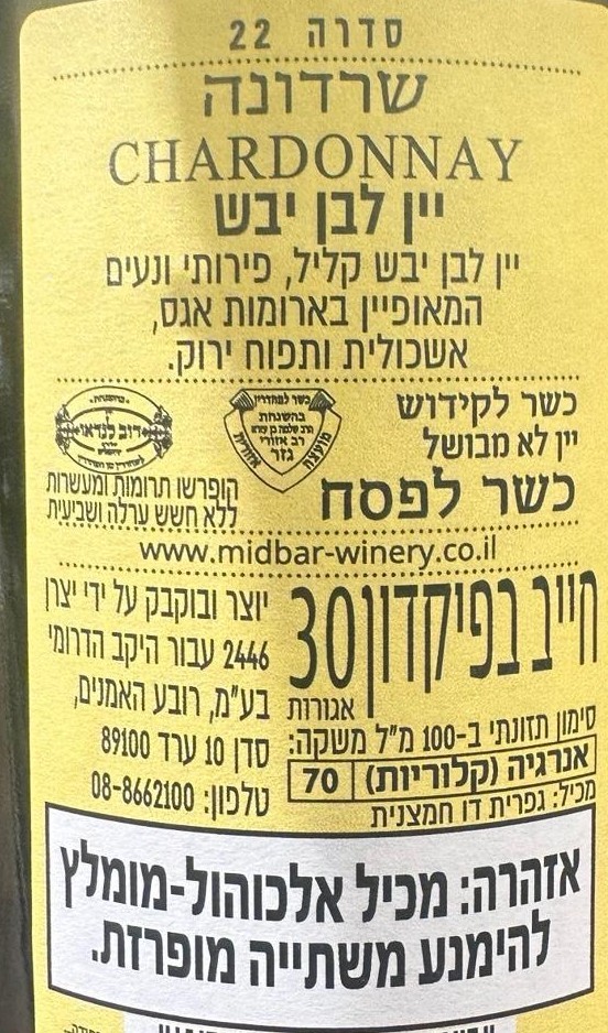 יין לבן יבש, פירותי וקיצי. אפריטיף מצוין. יין שרדונה יבש בעל צבע זהב בהיר וגוון ירקרק. יש לו ארומות של פרי הדר בגוון אשכולית לבנה ולימון בשילוב פירות גלעין כגון אפרסק לבן. גוף בינוני ורך, ובפה טעמי פרי מודגש. זהו יין שרדונה עשיר מחד, ופריך ורענן במיוחד מאידך.יין שמתאים במיוחד למנות אסיאתיות שונות (שאינן חריפות מדי), למנות גבינה מתקתקות ולקינוחים.